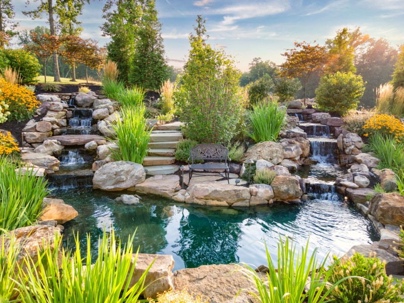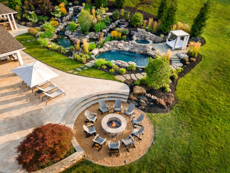 Outdoor spaces built around a pool, pond, and loggia