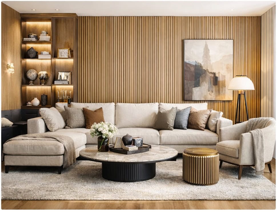 Designers typically choose larger rugs that allow furniture to sit partially or fully on top. This anchors the layout and makes the room feel more cohesive.
