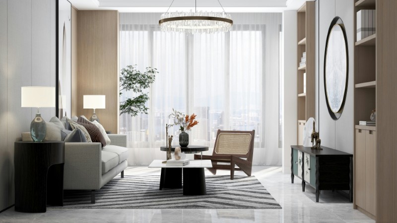 Builder-grade interiors often suffer from undersized rugs severely more than aging homes, with generic or undersized rugs looking like postage stamps on the fresh floors.