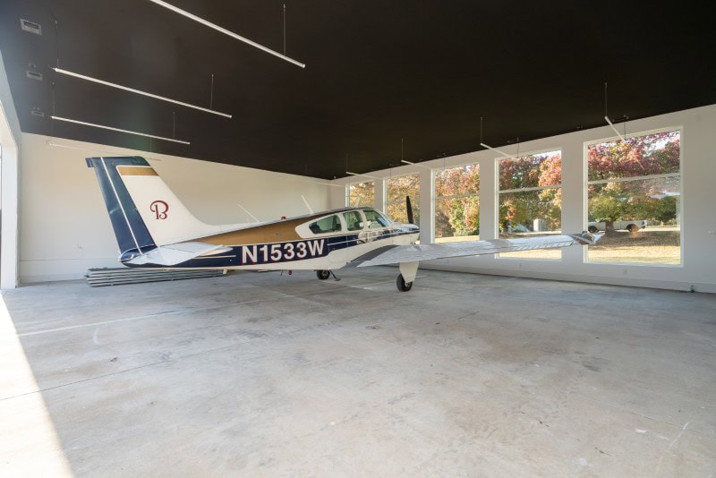 The space connects directly to the home’s three-car garage, making it easy to move between aircraft storage and the main residence while keeping equipment protected from the elements.