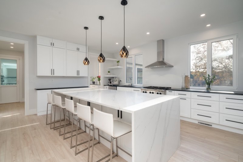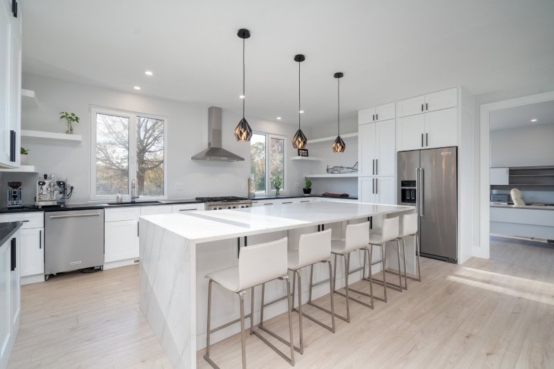 The space features updated appliances and a waterfall-edge island that anchors the room, creating a natural gathering point for both casual meals and larger gatherings.