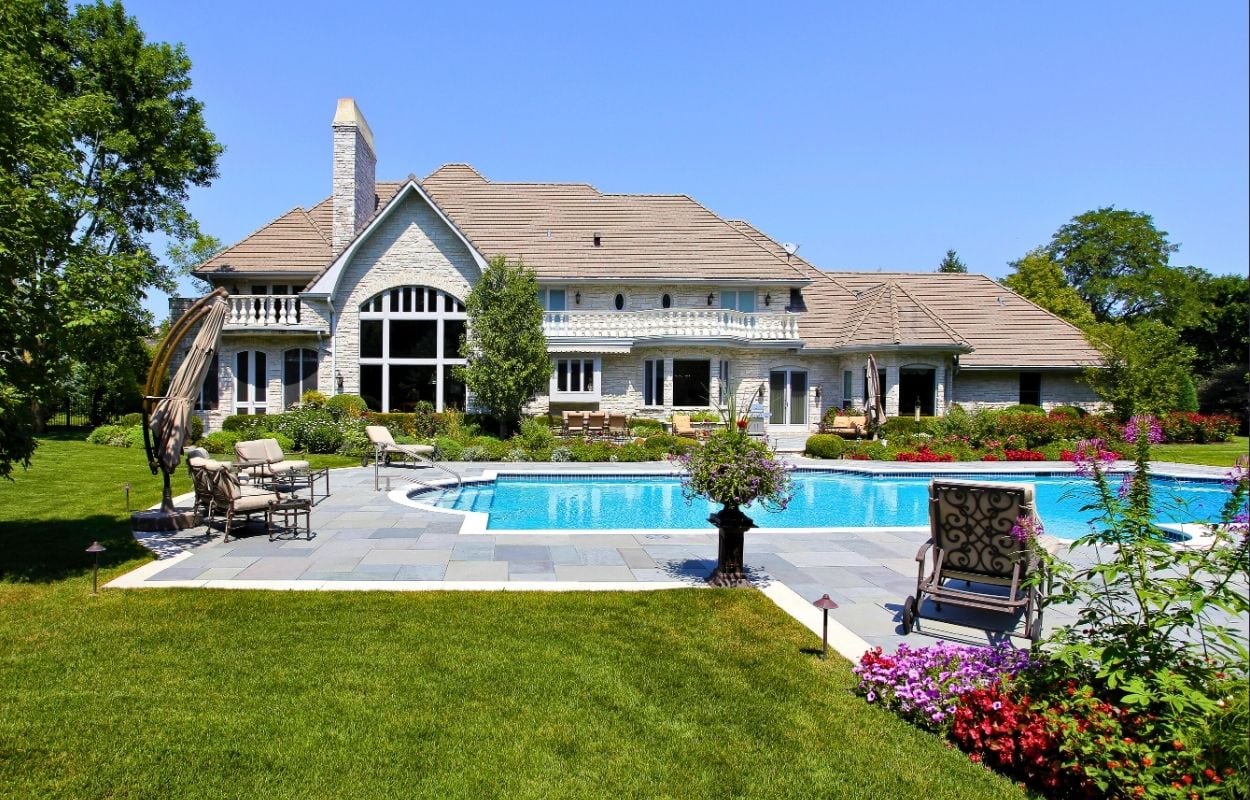 Estate properties often include full pool houses — standalone buildings with lounges, kitchens, bathrooms, and sometimes bedrooms.