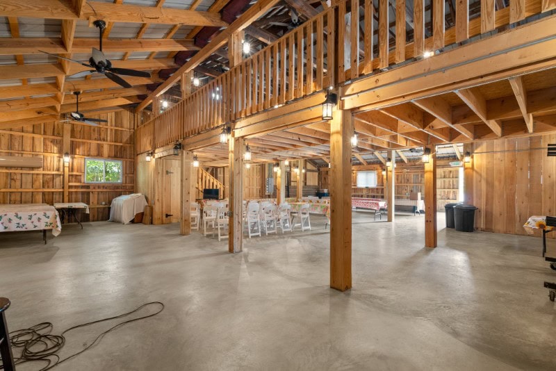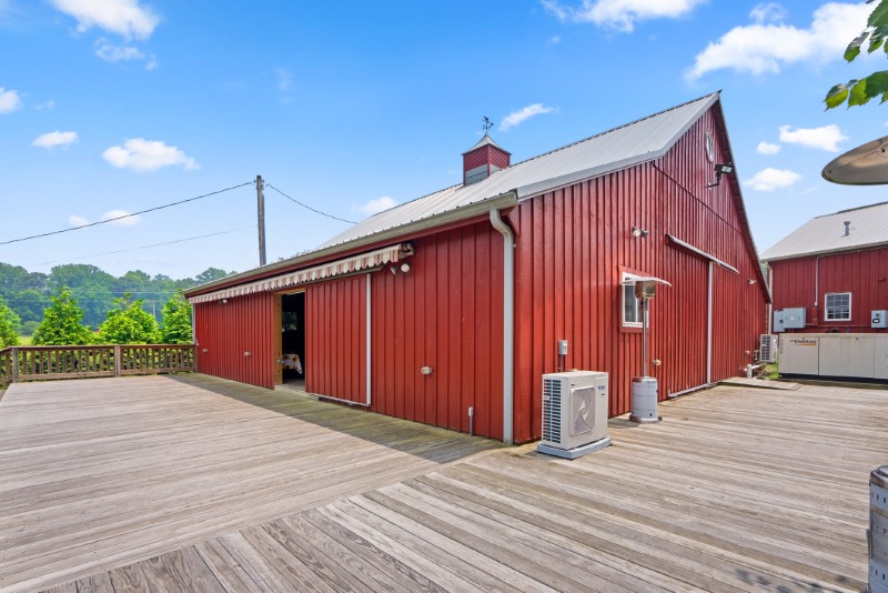 Three large barns anchor the property, including one configured as an event barn.