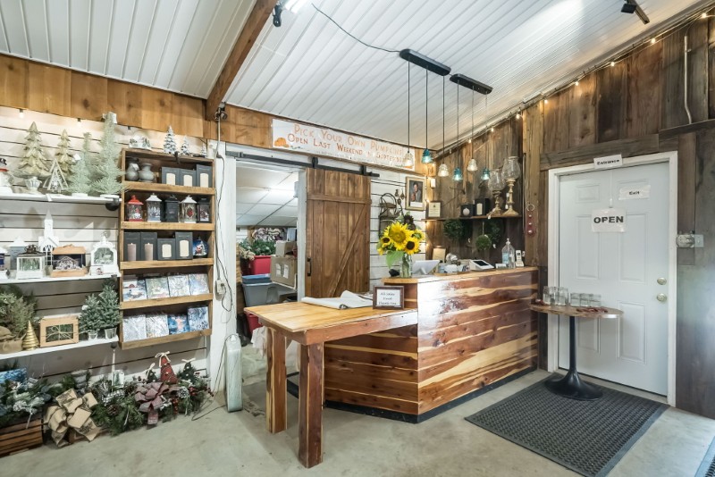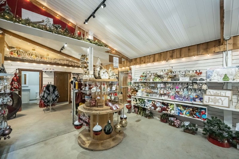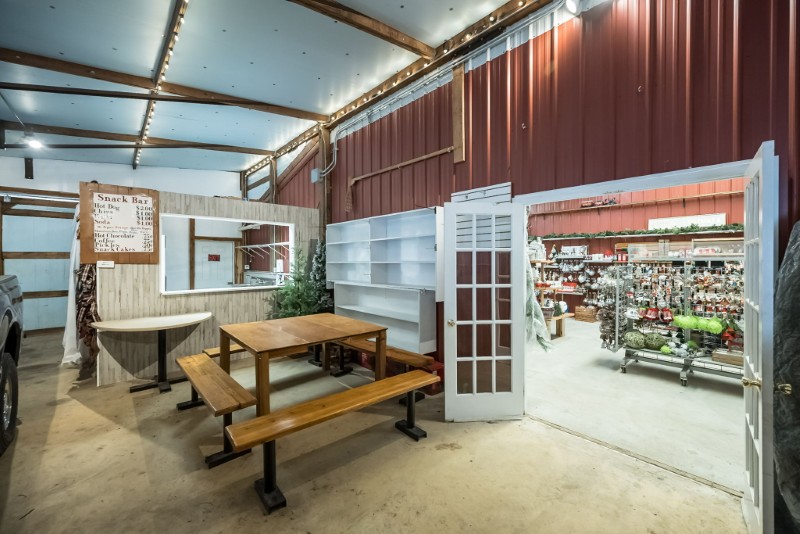 One of the standout structures on the property is a large barn currently used as a retail space, complete with a full kitchen and bathrooms.