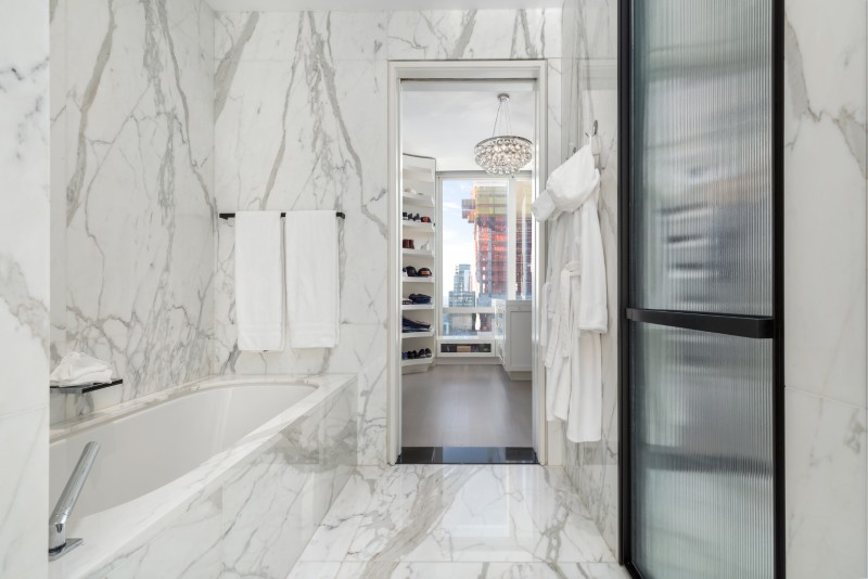 The bathrooms — finished in showpiece slabs of veined stone — extend the tower’s views into even the most private rooms. Large soaking tubs sit beneath marble surrounds, while park and skyline views unfold through glass panels that anchor the bath to its Midtown perch.