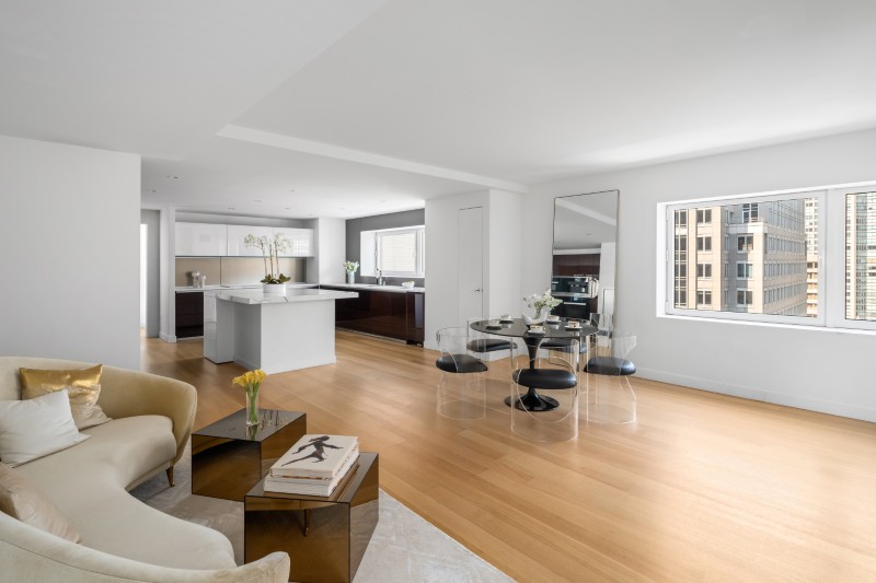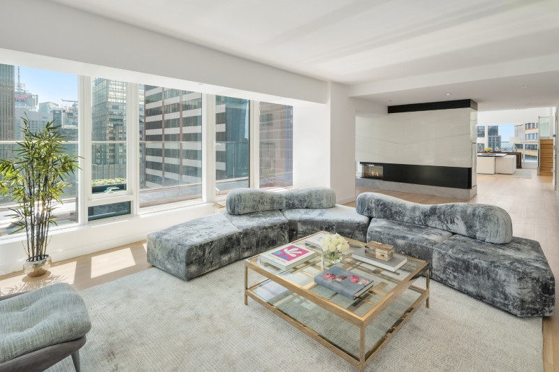 The great room of the $7,195,000 penthouse sets the entire tone — bright, expansive, and constantly pulling the eye outward to Midtown’s towers.