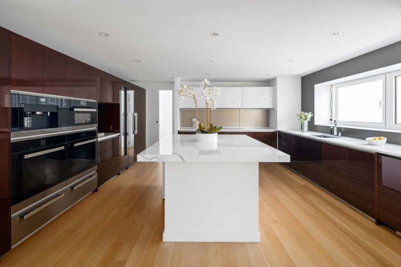 The kitchen combines streamlined Italian design with warmth — walnut cabinetry, expansive marble counters, and a generously sized island that doubles as prep space and casual seating.