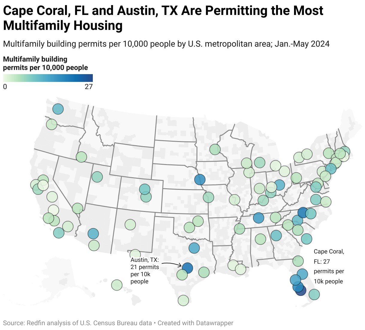 Based on new data from Redfin, U.S. builders obtained permits to construct 13 multifamily housing units for every 10,000 people in the U.S. so far this year, down nearly 30% from an average of 18 during the same periods in 2021-2023.