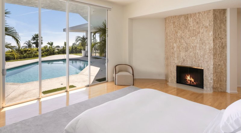 The private primary suite includes a wood-burning fireplace and direct access to the outdoor terrace and pool area.