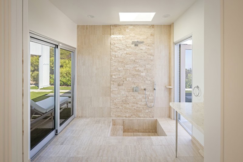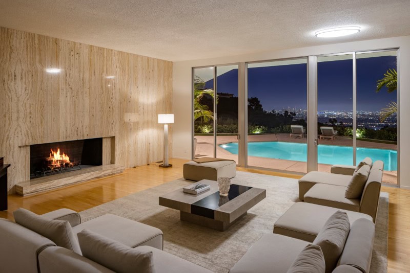 Approximately 11-foot ceilings create an airy atmosphere, while a full-height travertine fireplace acts as the architectural anchor for the space. The room flows directly toward the outdoor terraces, reinforcing the home’s indoor-outdoor design philosophy.