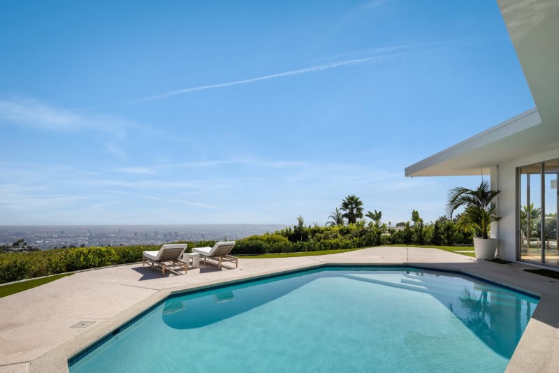 Rather than functioning purely as a recreational feature, the pool reads as a sculptural extension of the home’s architecture, reinforcing the modernist composition of the property.