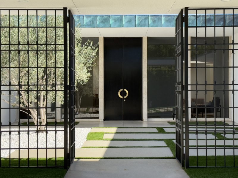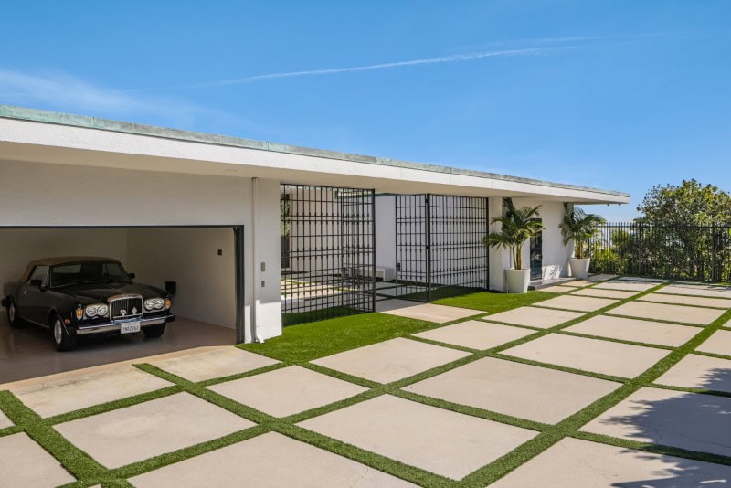 A gated entrance opens to a large motor court finished with grass-block paving, a design detail that softens the hardscape while maintaining the property’s modernist aesthetic.