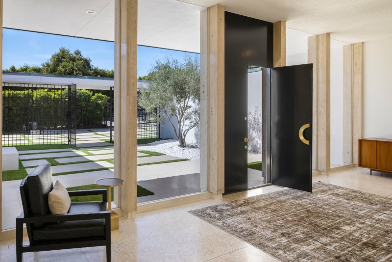 One of the home’s defining architectural moments arrives at the front entry.