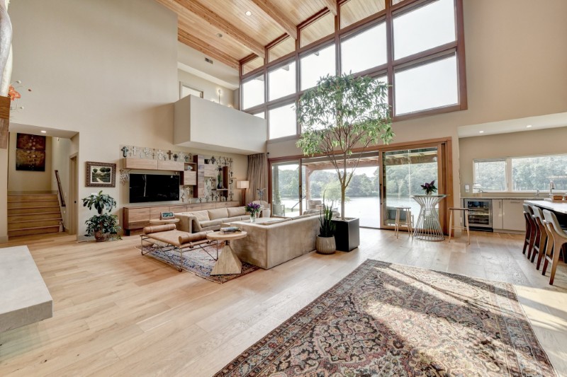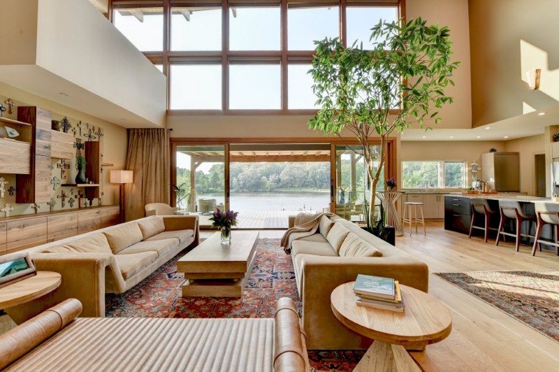 Post-and-beam construction and floor-to-ceiling glass set the tone, centering daily life around a LaCantina door system that opens to a lakefront deck.