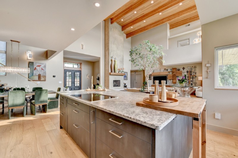 The heart of the home is a LEICHT-imported kitchen built for serious cooking and easy entertaining. Materials lean contemporary and durable, aligning with the home’s low-maintenance mission.