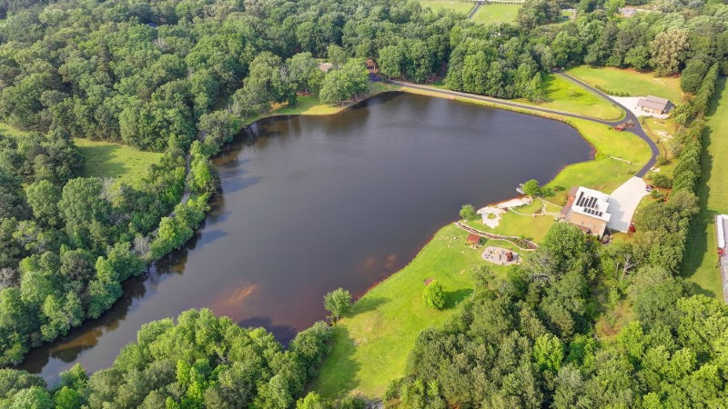 The setting is spring-fed and private: a lake with sand beach and dock, broad pastures, and wide-open skies about 60 minutes from downtown Atlanta.
