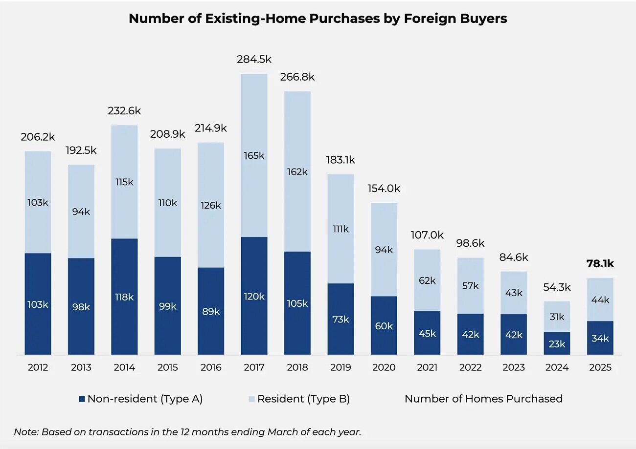From April 2024 to March 2025, international buyers snapped up 78,100 existing homes–a 44% jump from the previous year and the first annual increase in foreign purchases since 2017. The dollar volume rose by more than one-third year-over-year, driven in part by a record median home price of $494,400 paid by overseas investors.