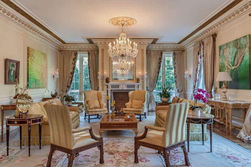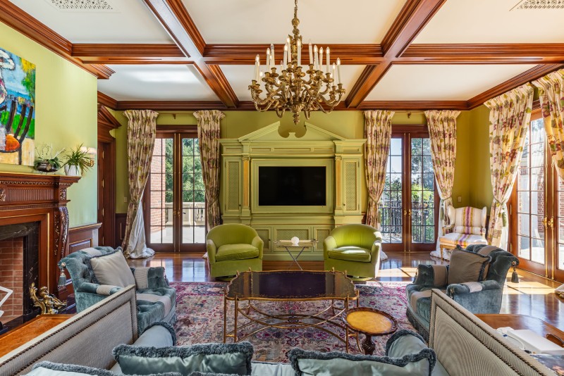 High ceilings, intricate millwork, and marble fireplaces continue across the home’s main entertaining rooms.