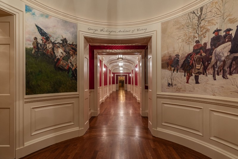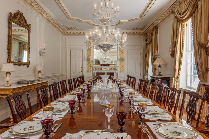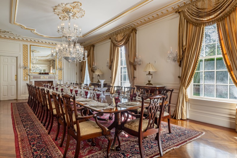 Throughout the home, high ceilings, custom moldings, marble fireplaces, and coffered ceilings reinforce its formal Georgian style.