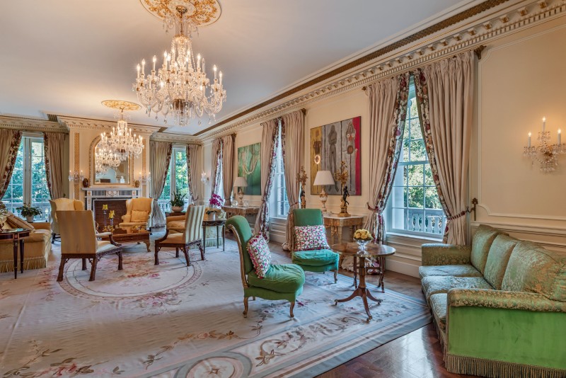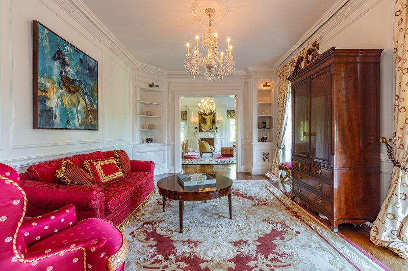 The formal living and dining rooms are designed for large-scale entertaining, with soaring ceilings, detailed moldings, and expansive French doors opening directly to terraces and landscaped grounds.