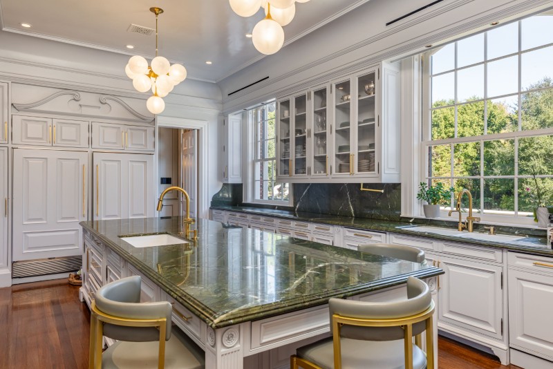 At the heart of the estate sits a chef’s kitchen outfitted with marble surfaces, bespoke cabinetry, premium appliances, and a large central island.