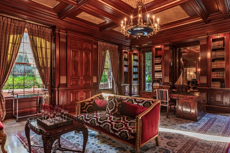 A bespoke mahogany office with rich woodwork offers a stately workspace
