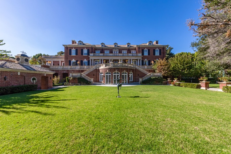 A gated motor court leads to a stately red-brick façade accented with limestone details, traditional columns, custom moldings, and classic blue shutters — giving the estate the look of an old-world European manor rather than a modern Los Angeles home.