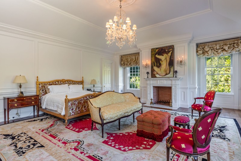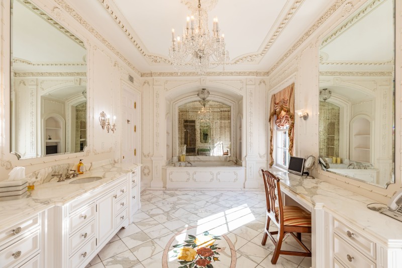 Two separate marble bathrooms serve the suite, reinforcing the estate’s palace-like scale.