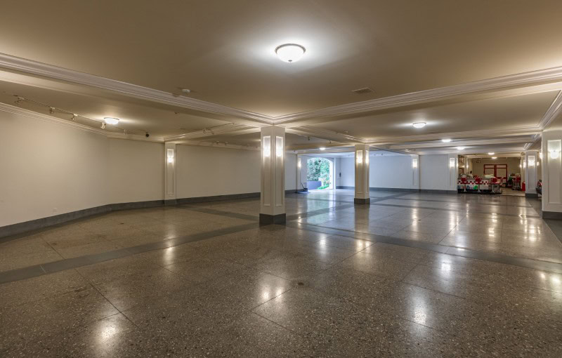 The estate’s lower level is dedicated almost entirely to entertaining and wellness — highlighted by an elegant oak-paneled ballroom complete with its own stage and bar that would make even the cast of Bridgerton swoon.