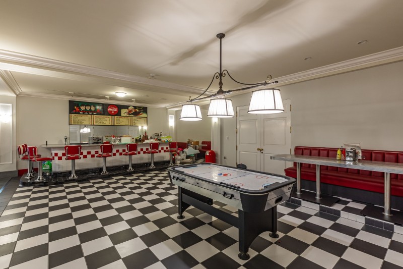 Designed by acclaimed architect Richard Manion, the property blends formal European architecture with over-the-top entertainment spaces including a massive ballroom for 120 people, a championship tennis court, and even a 12-car showroom garage set with an old school soda fountain diner.