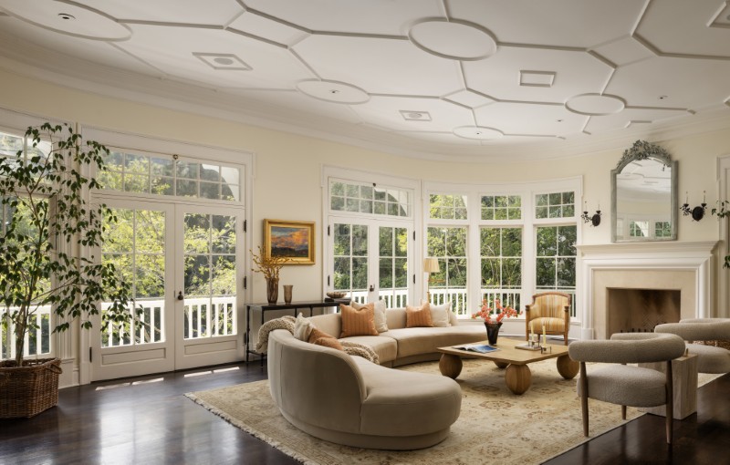 Inside, soaring ceilings, curved glass windows, and French doors set an airy tone. The formal living room anchors the plan with a marble fireplace, while the dining room handles big-night hosting with ease.