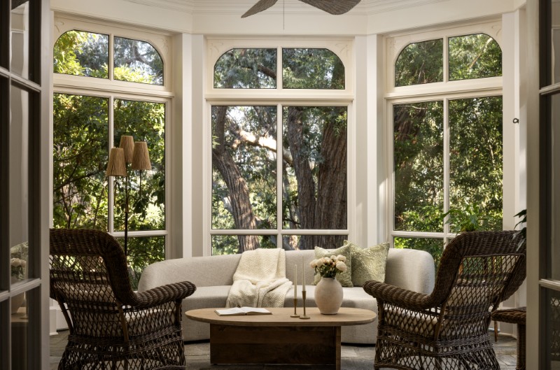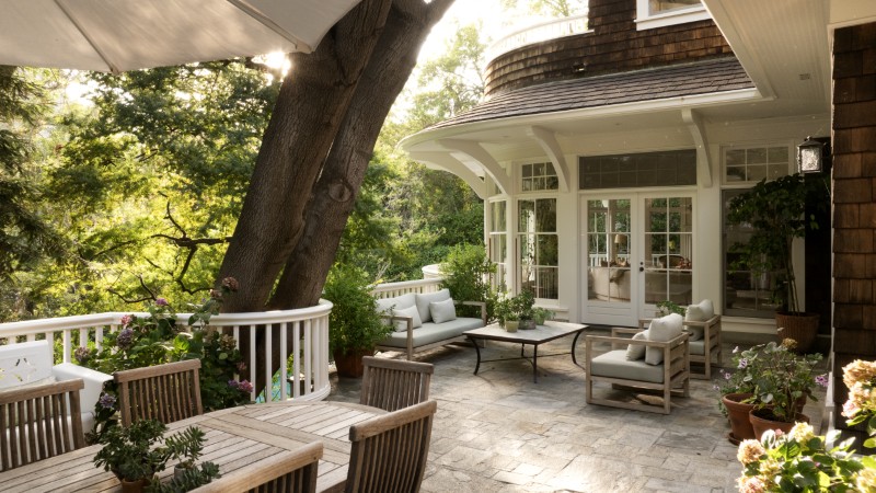 A gated drive winds through mature hydrangea, wisteria, and shade trees — a living reminder of the site’s historic botanical garden past — before revealing the house and motor court.