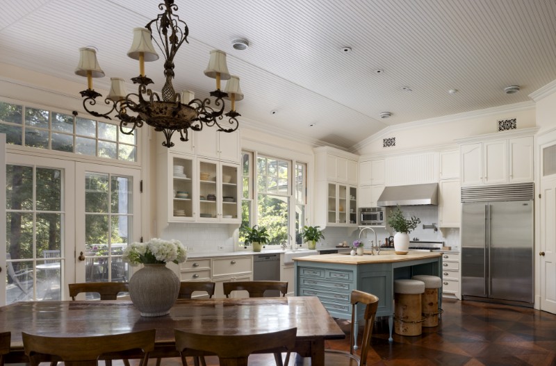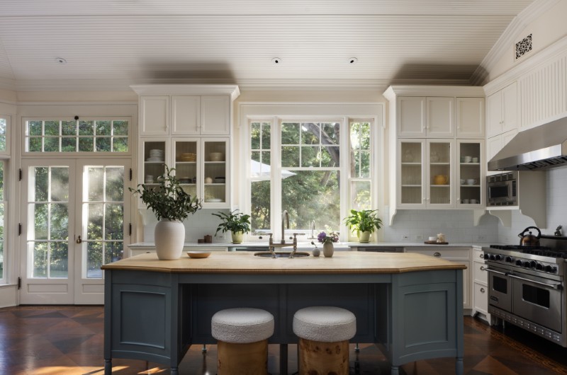 A butcher-block island and three sinks support real prep. Appliances include a Viking range, Sub-Zero refrigeration, and dual Miele dishwashers, with a proper pantry to keep counters clear.