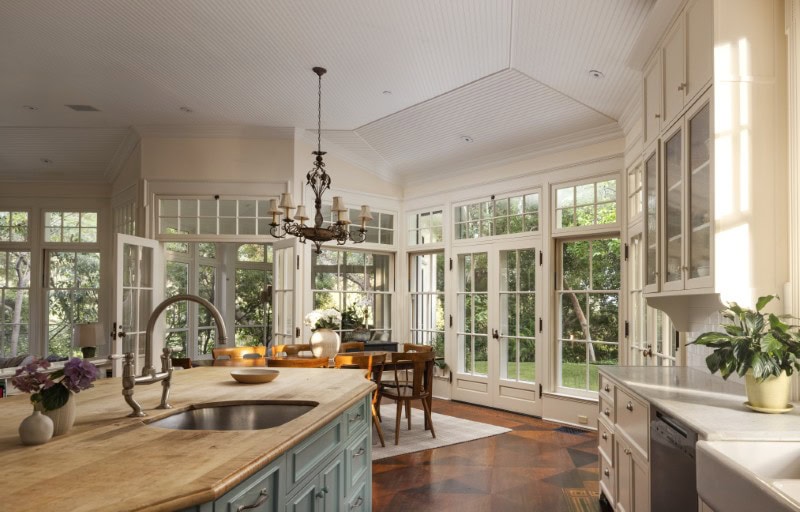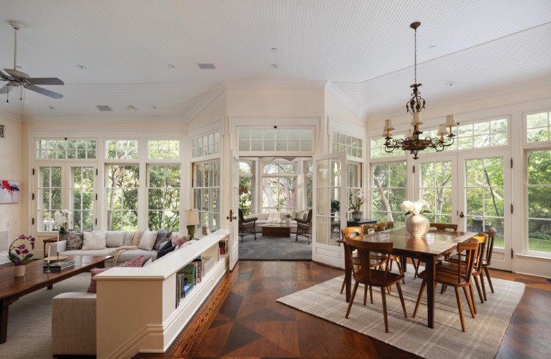 A step-down family room with media center and fireplace meets a sun-splashed breakfast area and glass-lined sunroom — easy spots for coffee, reading, or watching the koi cruise by.