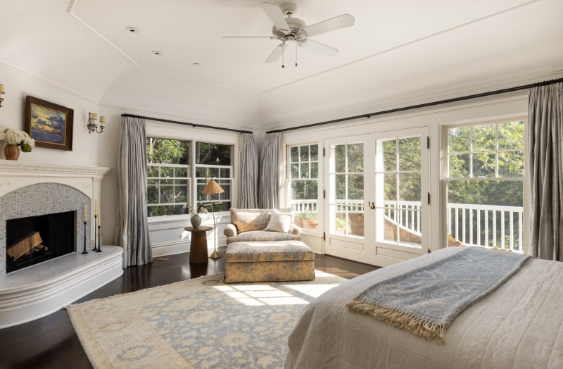 Today, the address returns to market as a two-parcel, nearly one-acre compound, fronted by mature trees and long, quiet approach.