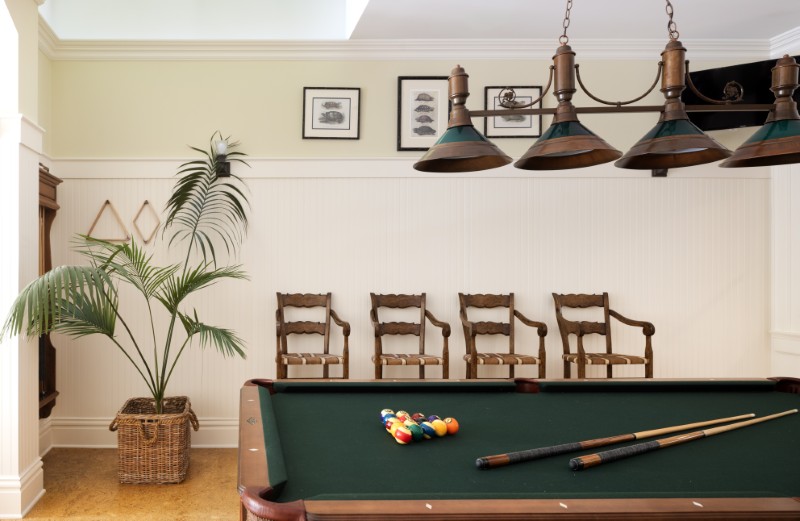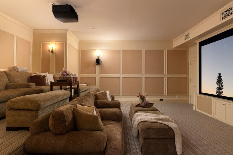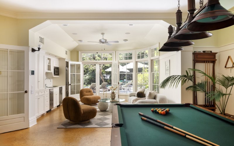 Downstairs, it’s all about options: private cinema, billiards room, gym, sauna, wine cellar, soundproof playroom, a light-filled atrium, and a kitchenette for snack runs between sets.
