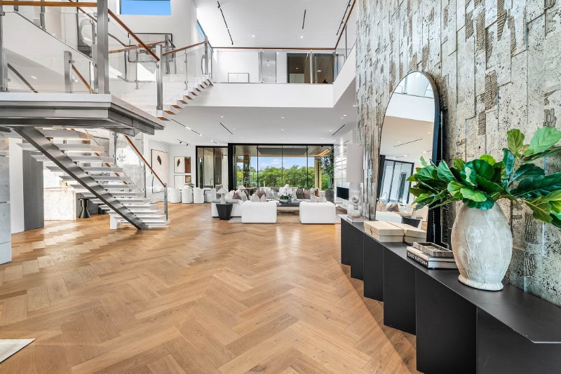 Even the entry experience includes a stainless steel sculpture by artist Alexander Krivosheiw, previously featured in Architectural Digest (a detail that underscores the home’s art-forward approach).