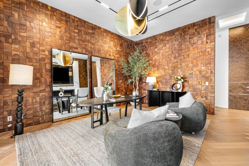 The office continues the design drama, featuring Brazilian teak blocks with brass inlays and a stone biofuel fireplace — more boutique hotel than typical home office.