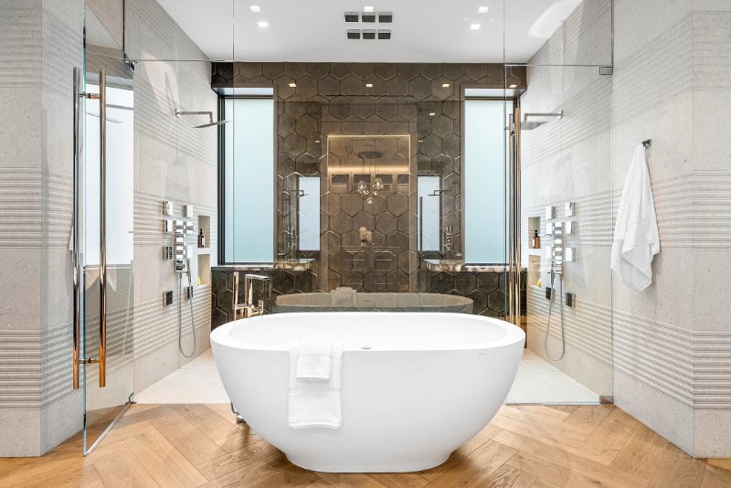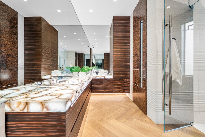 Inside, the bath leans heavily into spa-inspired materials: backlit agate countertops, integral stone sinks, a freestanding soaking tub, titanium-tiled shower, dual water closets, and two custom walk-in closets.
