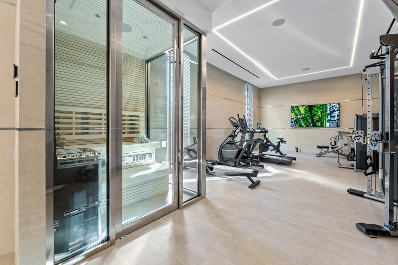 A private fitness and spa suite includes a state-of-the-art gym with white aspen finishes, infrared sauna, red-light therapy, and salt therapy room. It functions as a self-contained retreat within the home.