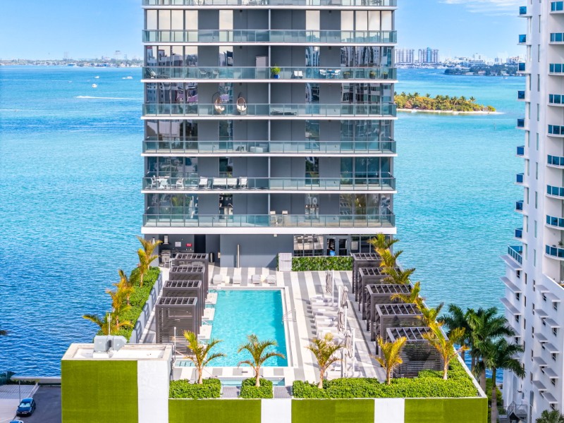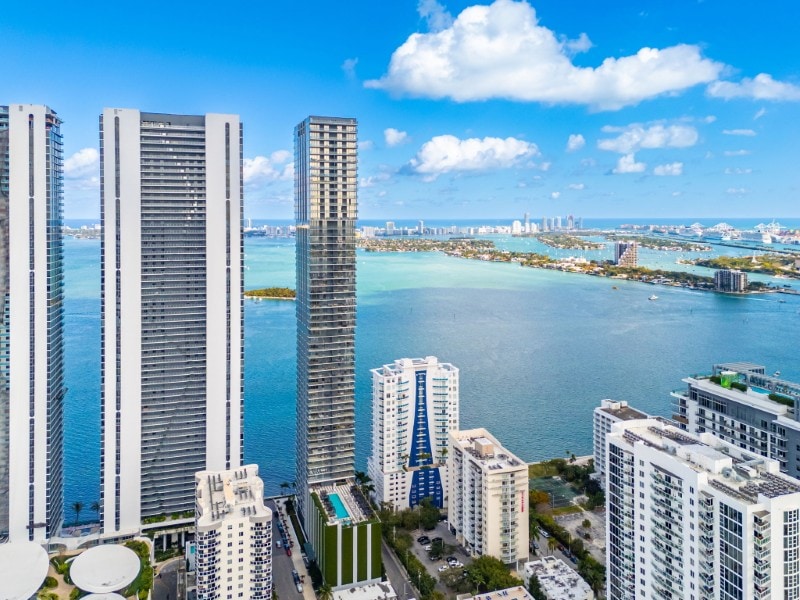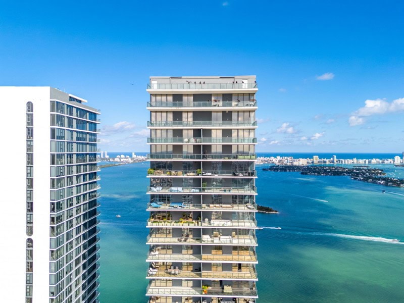The tower stands in Miami’s Edgewater neighborhood, directly facing Biscayne Bay.
