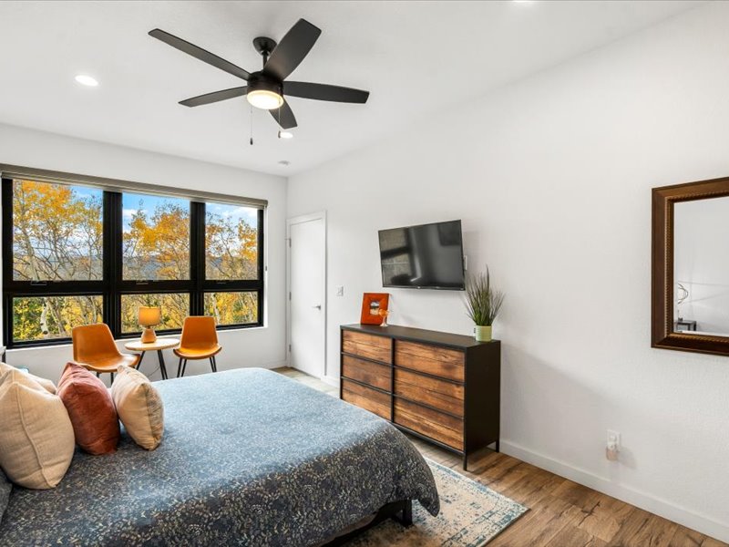 Designed by Vitruvius Properties, the 3-bedroom, 4-bath residence stretches across 2,300 square feet and frames sweeping 14er views through floor-to-ceiling glass.