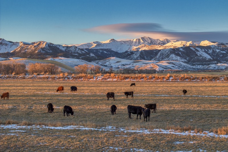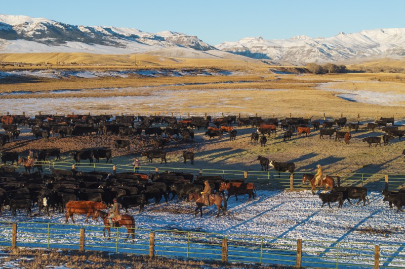 The ranch supports about 1,300 head of cattle year-round, with hay meadows, pastures, and trout-filled rivers stretching beneath the Absaroka Mountains.