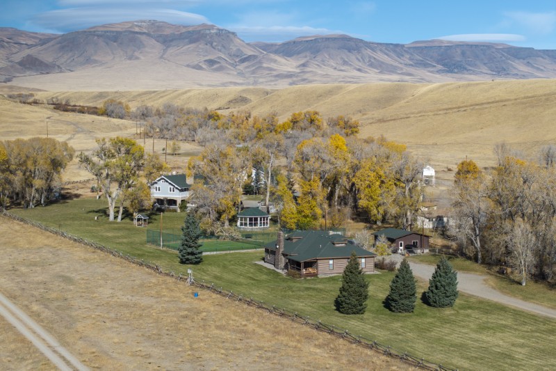 At the center of the Pitchfork Ranch is the Stone House, built in 1914 from hand-cut sandstone. It’s surrounded by eight additional residences, two timber barns, and a full suite of working pens that make up the ranch’s operational hub.