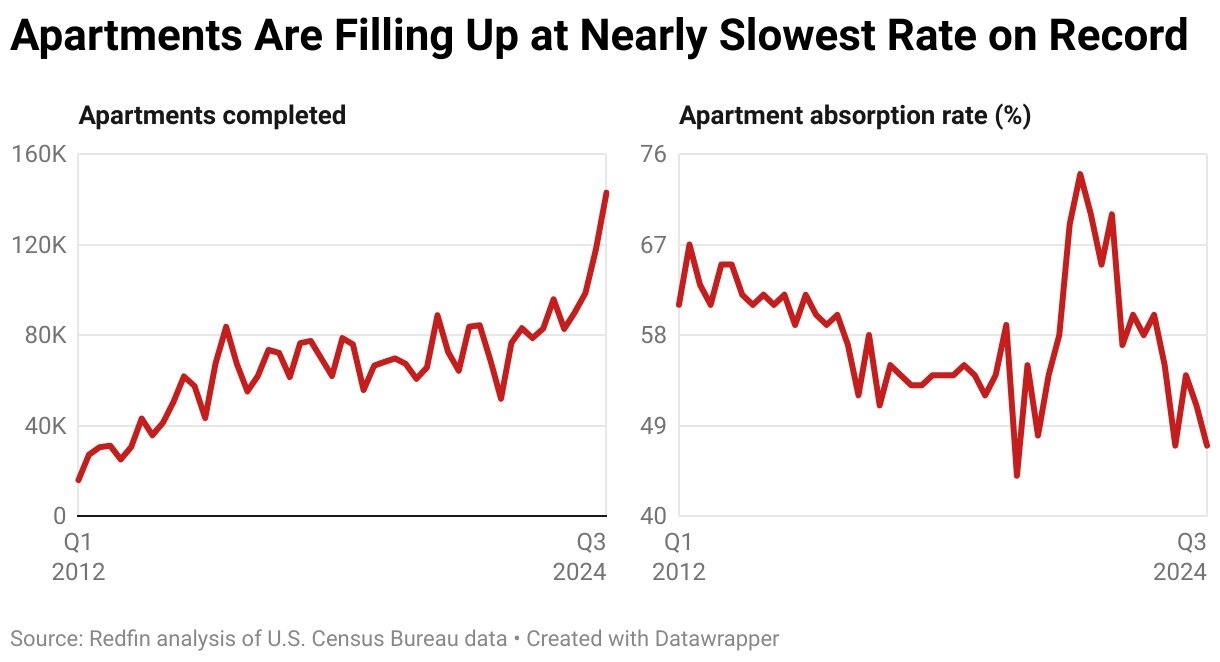 New data from Redfin reveals that less than half (47%) of newly built apartments completed in Q3 2024 were rented within three months. This matches Q4 2023 for the lowest absorption rate on record, aside from the early pandemic period.