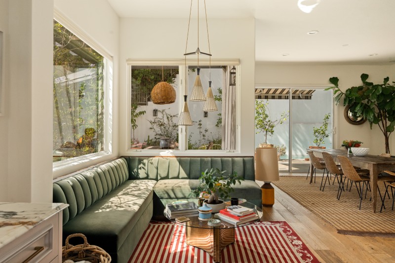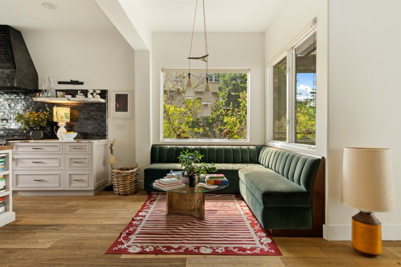 Custom Farrow & Ball–painted cabinetry adds warmth, while the built-in banquette provides an inviting nook for casual dining or late-night chats.