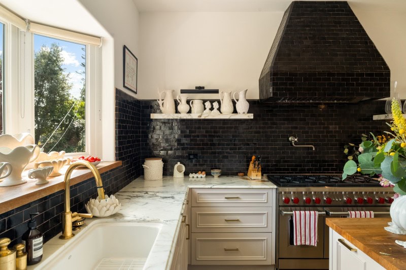 The kitchen is the undeniable centerpiece of the home — a perfectly executed mix of function and flair. Outfitted with top-of-the-line appliances, marble countertops, and a black Zellige tile backsplash, it balances bold style with everyday practicality.