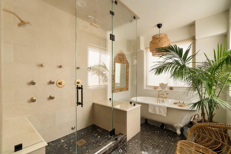 Upstairs, the primary suite feels like its own private retreat. Dual closets, a spa-style bathroom with soaking tub and steam shower, and a wrap-around balcony make it one of the home’s most coveted spaces.