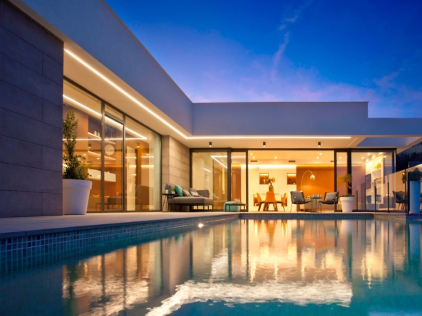 This new build villa is part of a residential development and has a unique design and layout with incredible sea views. The property is distributed over 2 levels, the upper floor benefits from the spacious master bedroom with ensuite bathroom and 2 other bedrooms separated by a shared bathroom. There is also an entrance hall, guest toilet, large living room and kitchen. There are large moveable doors so that you can have an open plan living/dining room and kitchen or the kitchen can be closed off. On the ground floor there is a large space of over 68m2 that can be used as a guest apartment or as an Entertainment area with a private terrace and independent rooms. Outside there is 66m2 of terrace with an infinity pool overlooking the Mediterranean Sea. There is also a carport and a storage room.