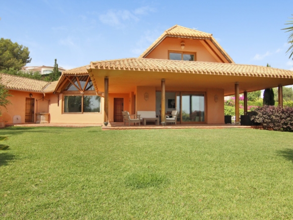 This Nordic design style chalet has both great sea and mountain views. It has a large light and airy living and dinning area with an open fire place and beautiful wooden ceilings. On the lower level there are four bedrooms with plenty of wardrobes and two bath rooms with the possibility to add a third one.On this level there is a large kitchen which leads onto a utility room and terrace. The 37m2 master en suite bedroom is on the upper floor with its own terrace and a lovely sea and panoramic view. Outside the well maintained garden has various trees and palms a swimming pool,terrace and a squash court .The large garage could quite easily be converted to a guest house.